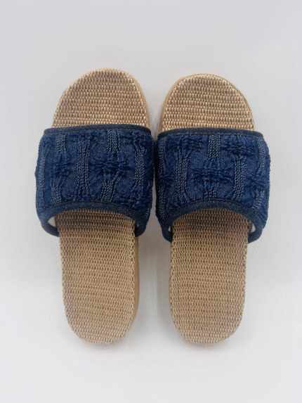 Denim Blue Embroidered Straw Slippers